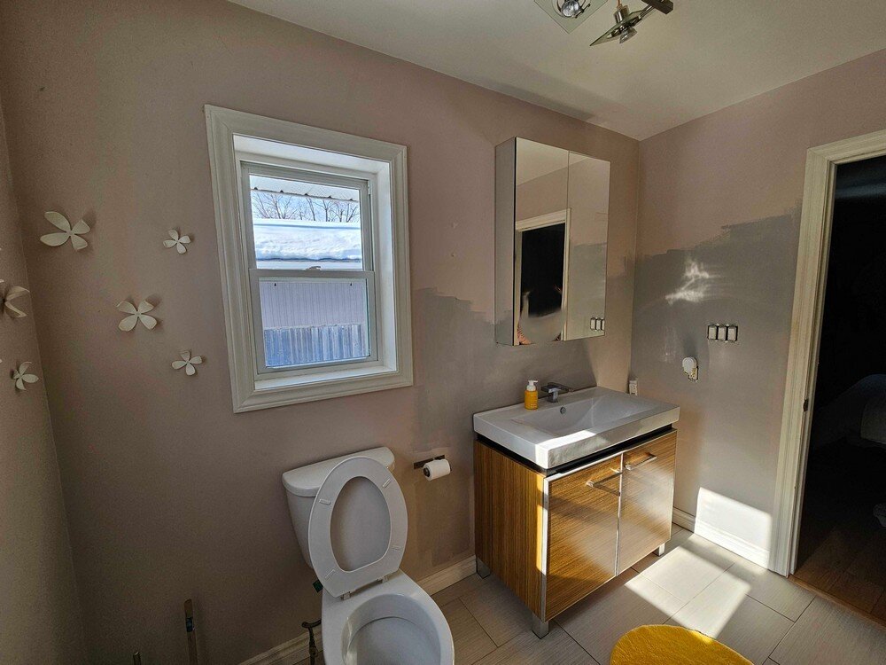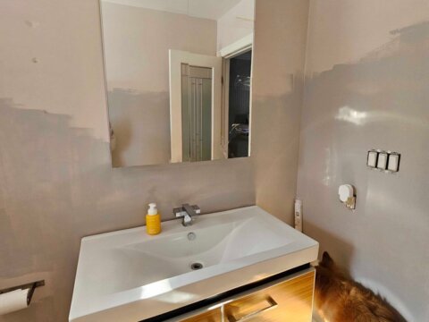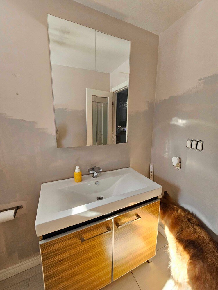– Drywall patch in bathroom (from prior plumbing repair access)